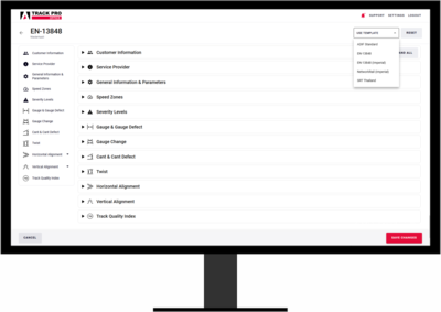 Neue Konfigurationsvorlagen für ADIF (Spanien) und Network Rail (Vereinigtes Königreich) sind jetzt verfügbar. Diese Vorlagen definieren wichtige Parameter wie Spurweite, Abtastschritt und Toleranzgrenzen, sodass Messungen den nationalen Prüfnormen entsprechen und die Projekteinrichtung vereinfacht wird.