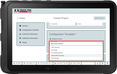 Eine überarbeitete Projektkonfigurationsseite ermöglicht es jetzt, Einstellungen aus gespeicherten Vorlagen vorzubelegen. Eine Konfigurationsvorlage definiert wichtige Parameter wie Spurweite, Abtastschritt und Toleranzgrenzen für einen bestimmten Gleistyp. Die Verwendung solcher Vorlagen reduziert wiederkehrende Dateneingaben bei der Erstellung neuer Projekte, sorgt für einheitliche Einstellungen und spart Zeit in der Office-Applikation.